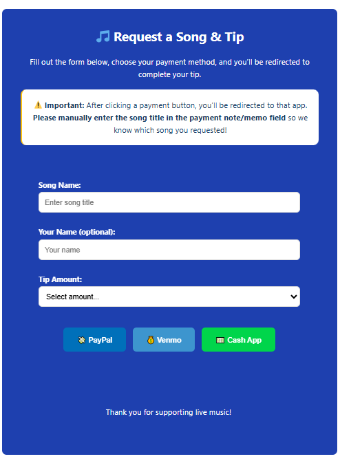 Your all-in-one AI workflow designed for musicians and bands โ boost fan engagement and increase tips at every live show. With a simple scan, your audience can send tips and request songs instantly from their phones.
